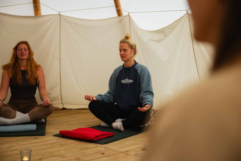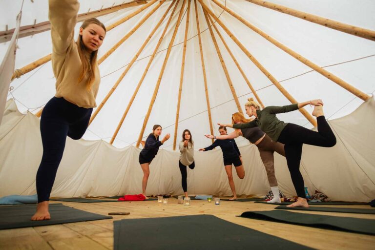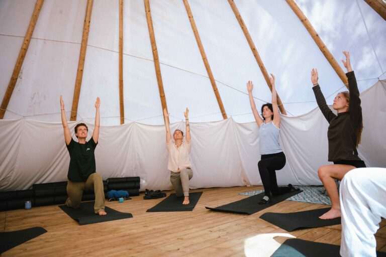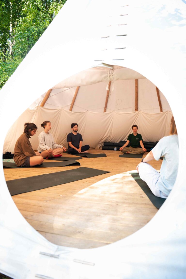Gruppens tält — En skyddad plats för rörelsesessioner och lugna kvällar när vädret slår om.