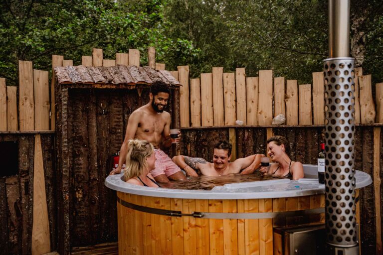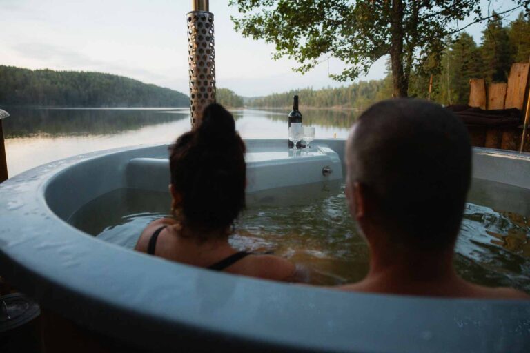 Slappna av i de utomhus jacuzzi-baden efter en full dag på vattnet — varmt, lugnt och omgiven av skog. Den perfekta återställningen mellan dagarna i vildmarken.