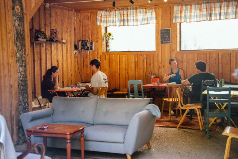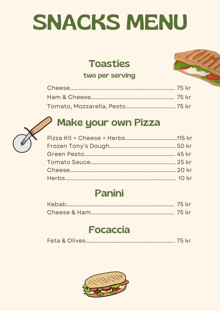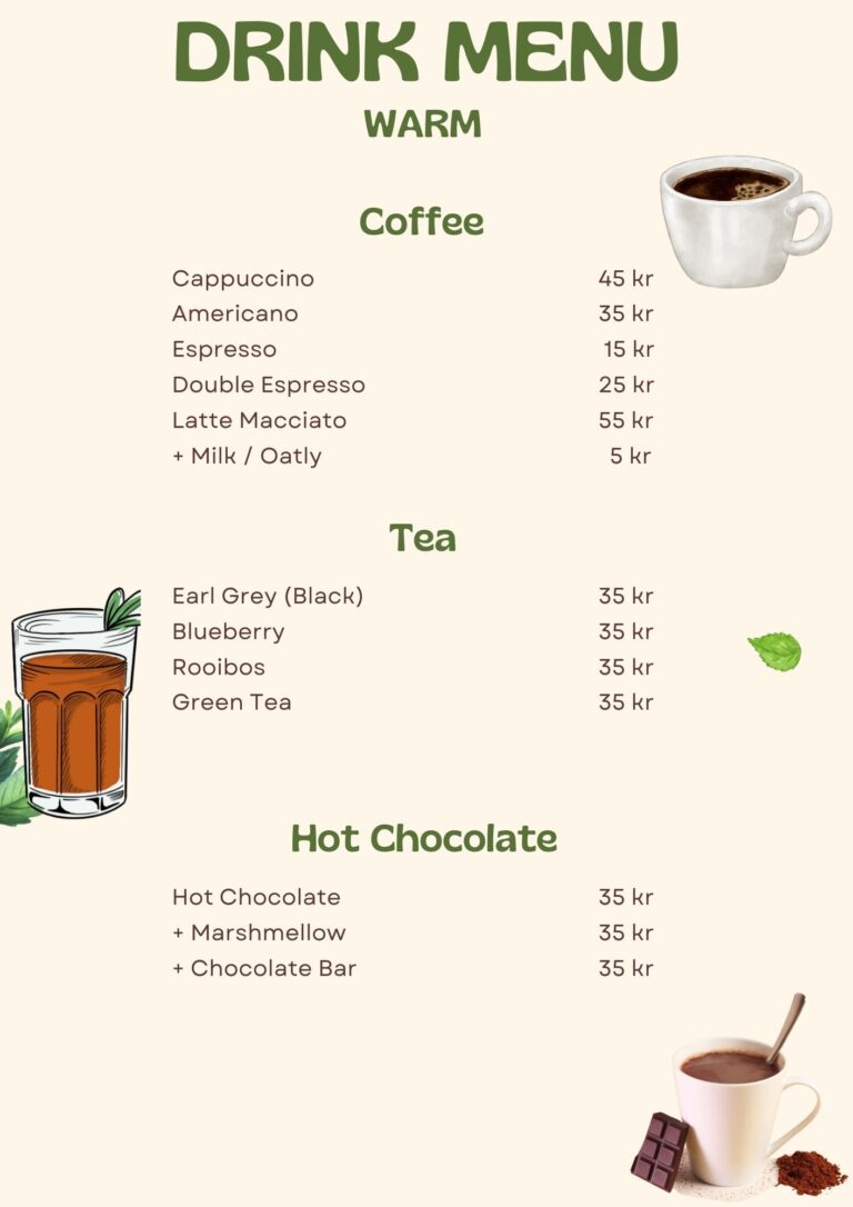 Kaffe, te, läsk och enkel comfort food på plats när du vill ta en paus från att göra ditt eget lägereldskaffe. Här hittar du också sällskapsspel och saker att läsa.
